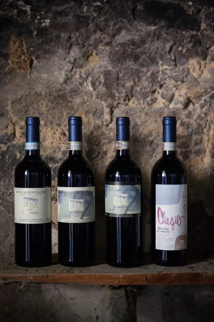Voor de Brunello wijnen laat hij de gisting langzaam onder temperatuurs-controle tot wel 45 dagen macereren. Dit geeft zeer elegante, aromatische wijnen met verfijnde tannines. De Rosso di Montalcino wijnen (15000 flessen) rijpen 9 maanden in eikenhouten vaten. 60% in Franse tonneaux van 500l en 40% in Sloveense grande botti van 4000 en 6000l. De Brunello di Montalcino wijnen (30000 flessen) rijpen gedurende 36 maanden in Franse tonneaux van 500l (33% nieuwe vaten). In uitstekende wijnjaren maakt hij nog twee top cuvées de “Brunello Ciliego” (500 flessen) en de “Brunello Riserva”.